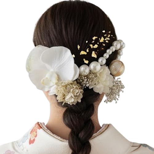 flower studio no107のランダムパールチェーン胡蝶蘭髪飾りはいかがでしょうか?洋装にも成人式の振袖にも似合う清楚なホワイトです。どんな色ともコーデしやすいですよ。35cmの長さのパールチェーンは大きい粒から小さい粒まで大きさいろいろ!変化のある粒が連結しており自在に髪にアレンジすることができます。胡蝶蘭・あじさい・かすみ草のお花やGOLDの和玉の装飾付きでお洒落!華やかでお薦め!