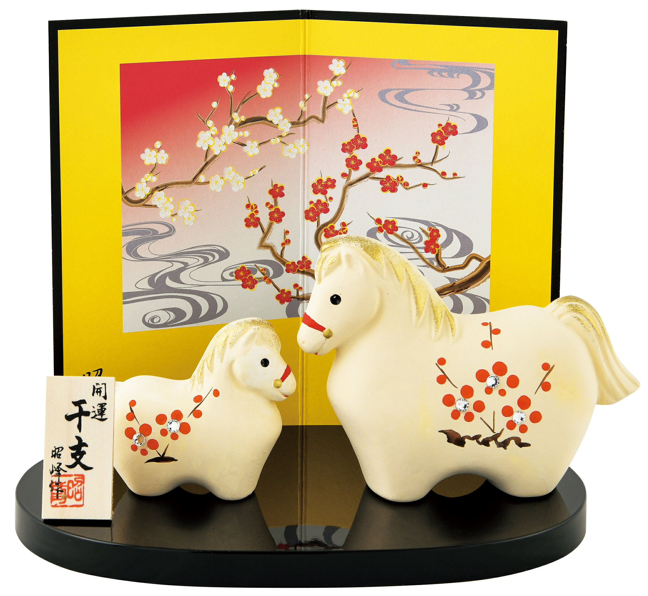 2026年の干支である「午」を象徴するこの置物は、温かみのある陶器の質感と、煌めくラインストーンの華やかさが絶妙に調和した逸品です。親子の馬が寄り添う姿は家庭円満や開運を連想させ、コンパクトなサイズ感ながらもお部屋の雰囲気を壊さず、玄関や棚に置くだけで品良くお正月らしさを演出してくれます。和の趣を感じさせつつ現代のインテリアにも馴染むため、さりげない季節感を楽しみたい方にぴったりです。