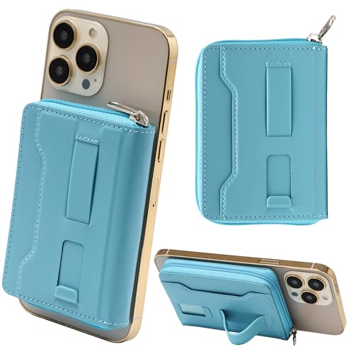 ブルーのお財布でオシャレですスマホスタンドにもなるので便利ですファスナー式の小銭入れや、カードポケットが付いていて便利です