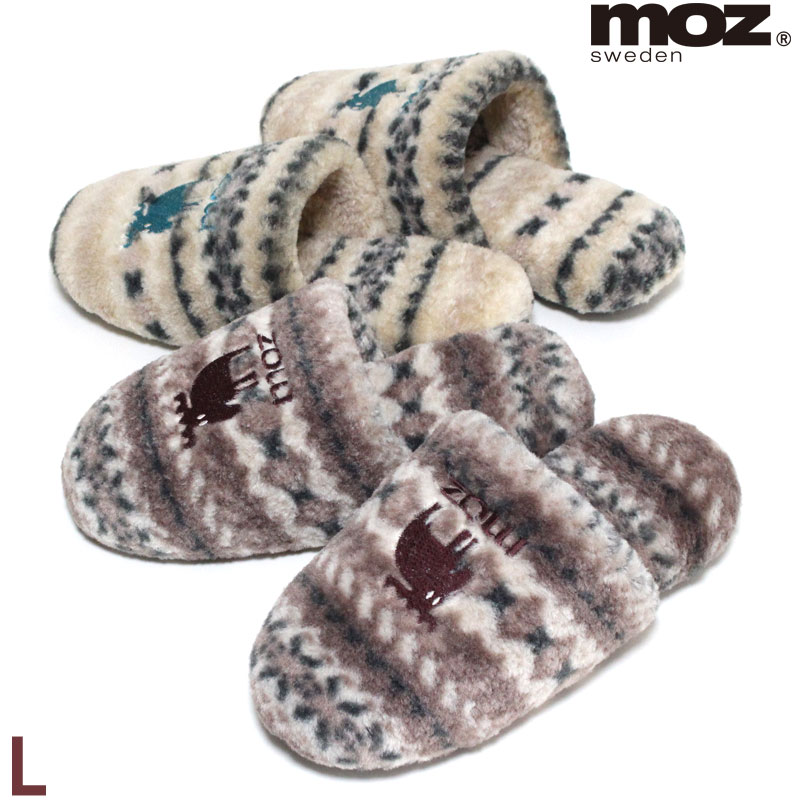 メンズ向け防寒スリッパとして、モズのものはいかがでしょうか? もこもこのボア素材なので冬でも暖かいスリッパです。ノルディック柄とヘラジカのアイコン刺繍がかわいいアイテムですね。