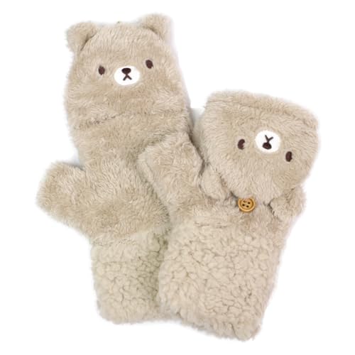 ベージュの くまさんのデザインで、オシャレですミトン型になっていて、指を出すことができて 2 WAY で使えて便利ですふわふわのボアの生地で滑らかで つけ心地がいいです