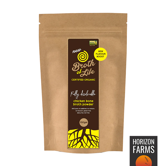 オーストラリアで厳選されたオーガニック放牧鶏の骨、オーガニック野菜やオーガニックスパイスをじっくり煮込んで粉末にした鶏ガラスープです。体にやさしい隠し味です。