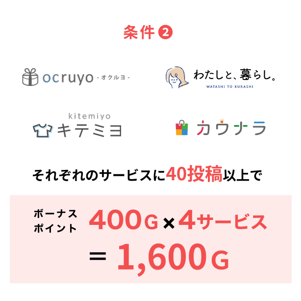 10投稿:100G②さらに、「オクルヨ」「わたしと、暮らし。」「キテミヨ」「カウナラ」で40投稿以上すると、サービス数に応じて最大1,600Gのボーナスポイントを進呈。