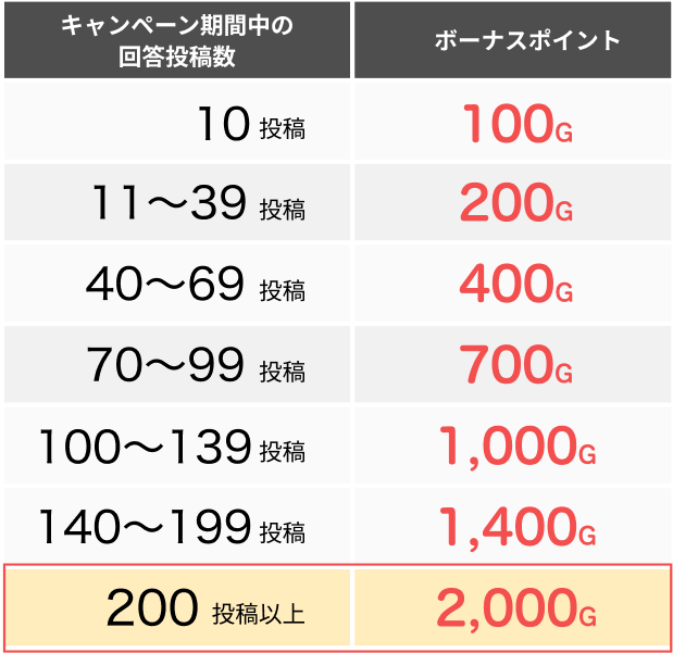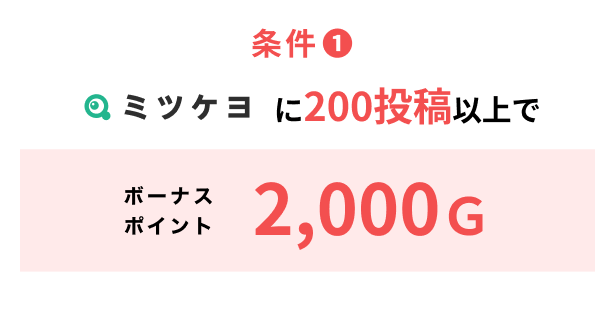 キャンペーン期間中に、「ミツケヨ」で回答を10投稿以上すると、投稿数に応じて、最大2,000Gのボーナスポイントを進呈。